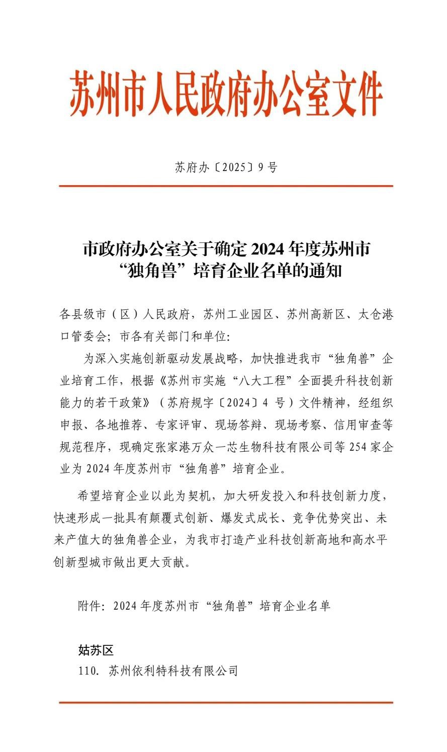 2025年2月11日,蘇州——近日,蘇州市政府正式發(fā)布《2024年度蘇州市“獨(dú)角獸”培育企業(yè)名單》,蘇州依利特科技有限公司作為姑蘇區(qū)首家且唯一入選企業(yè),成功躋身這一具有戰(zhàn)略意義的創(chuàng)新梯隊(duì)。這一里程碑式突破,標(biāo)志著姑蘇區(qū)在培育高成長(zhǎng)性科技企業(yè)、構(gòu)建現(xiàn)代化產(chǎn)業(yè)體系方面取得重要進(jìn)展。
