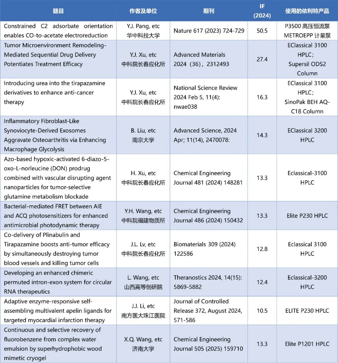 近年來,在中國科研實力的快速崛起中,國產(chǎn)分析儀器扮演了重要角色。其中使用為廣泛的高效液相色譜,在科研領(lǐng)域的先進(jìn)前沿應(yīng)用也逐漸打破“進(jìn)口依賴”。以依利特高效液相色譜、制備/半制備色譜和色譜柱為代表,國產(chǎn)液相色譜儀器及耗材的性能已然獲得了眾多科研工作者的信任,成為協(xié)力完成高水平科研項目背后的隱形功臣。下表列舉了部分近年發(fā)表在Nature、Advanced Materials、National Science Review、Advanced Science、Chemical Engineering Journal、Biomaterials等影響因子 IF > 10的刊物上的部分文獻(xiàn)。