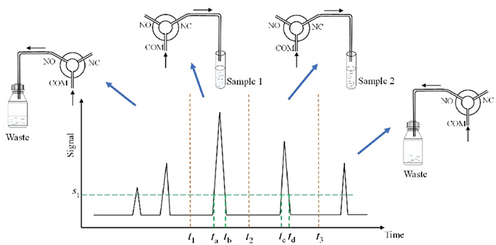 時(shí)間+閾值組合(更精準(zhǔn)): 例如,設(shè)定在t1-t2時(shí)間段內(nèi)收集“樣品1”,但只有當(dāng)此時(shí)間段內(nèi)信號(hào)強(qiáng)度也同時(shí)達(dá)到閾值s時(shí),才真正啟動(dòng)收集閥切換到收集狀態(tài)(NC口連通),否則視為無效或廢液(NO口連通)。這有效避免了收集到非目標(biāo)或低濃度餾分,提高了目標(biāo)物的純度和回收率。