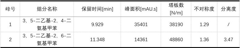 依利特新款的EClassical3200液相色譜儀搭配經(jīng)典的SinoPak C18色譜柱,對二乙基甲苯二胺同分異構體進行分析,分離度非常好,柱效也很高,滿足定性定量分析的需求。