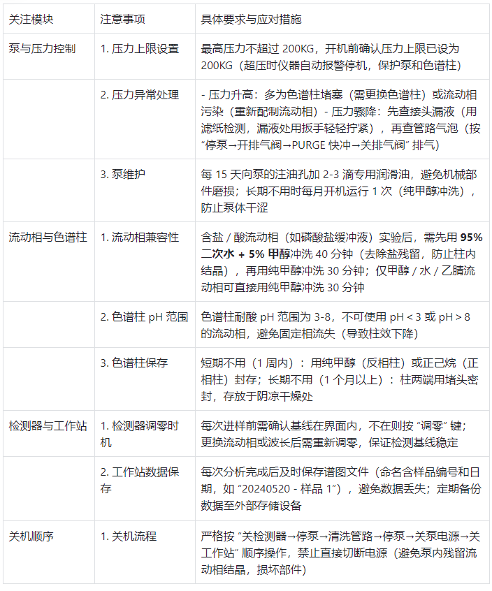 表格 3:HPLC 操作關鍵注意事項