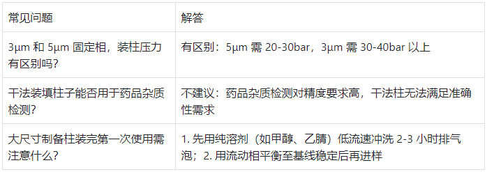 小粒徑(<20μm)用濕法,大粒徑(>25μm)用干法;分析柱用標(biāo)準(zhǔn)濕法,制備柱(>20mm)加壓縮;裝完必測(cè)柱效,不合格就重裝。