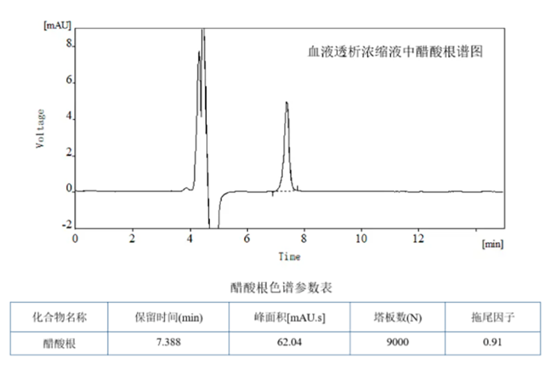 醋酸根:按A:B:水:流動(dòng)相=1:1.225:16.388:16.387(v/v)的比例稀釋,以0.45μm膜過(guò)濾,測(cè)定。