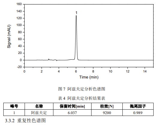 樣品溶液配制:取供試品 1 藥品 1 粒,稱量質(zhì)量為 0.1477g,取部分后研磨,稱取質(zhì)量為 0.0287g,用 2mL 甲醇溶解,離心,取上層清液,濾過;量取 0.5mL 上述溶液,量取乙腈 / 水 = 10:90 的溶液 0.5mL 將其稀釋,得含供試品 1 濃度為 7.175mg/mL 的供試品溶液 1。按每粒藥品含阿茲夫定 1mg 計算,供試品溶液 1 中的阿茲夫定含量為 0.049mg/mL。
