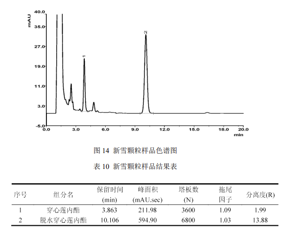依利特使用新款的 EClassical 3200 液相色譜儀搭配 Hypersil ODS2 色譜柱,對新雪顆粒中穿心蓮內(nèi)酯和脫水穿心蓮內(nèi)酯進(jìn)行了分析檢測,結(jié)果顯示目標(biāo)物峰形良好,柱效高,可以達(dá)到基線分離,滿足定性定量分析的需求。