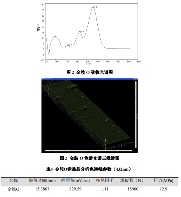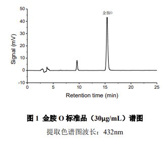 按照《中藥材及中藥飲片藥品檢驗(yàn)補(bǔ)充檢驗(yàn)方法和檢驗(yàn)項(xiàng)目批準(zhǔn)件》食藥監(jiān)稽函 [2012] 200 號(hào)文件中金胺 O 檢測(cè)方法,使用大連依利特分析儀器有限公司配置 DAD230 + 二極管陣列檢測(cè)器的高效液相色譜儀可以分析檢測(cè)中藥材和中藥飲片中的金胺 O,系統(tǒng)穩(wěn)定重復(fù),線性相關(guān)性良好,檢出限低,通過(guò)光譜圖比對(duì)、峰純度計(jì)算功能,能夠準(zhǔn)確定性,避免假陽(yáng)性現(xiàn)象,滿足藥監(jiān)部門制定的標(biāo)準(zhǔn)要求。