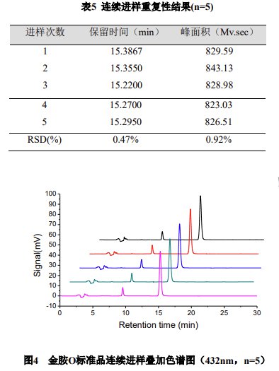 連續(xù)進(jìn)樣 5 次,計(jì)算金胺 O 色譜峰保留時(shí)間和峰面積的 RSD 值,均小于 1%。