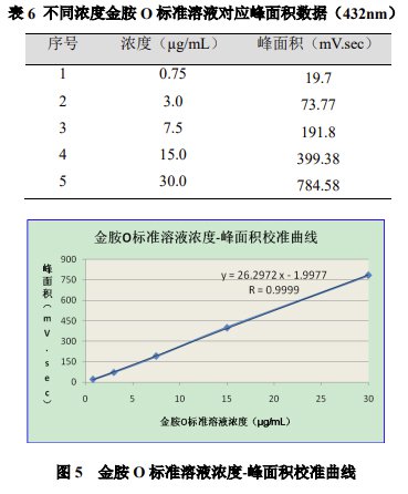 配制濃度分別為 0.75μg/mL、3.0μg/mL、7.5μg/mL、15.0μg/mL、30.0μg/mL 的金胺 O 標(biāo)準(zhǔn)工作溶液,按濃度由低至高進(jìn)樣,以標(biāo)準(zhǔn)品濃度為橫坐標(biāo),峰面積為縱坐標(biāo),繪制校準(zhǔn)曲線。結(jié)果顯示,金胺 O 線性相關(guān)系數(shù)達(dá) 0.9999 (表 6、圖 5)。