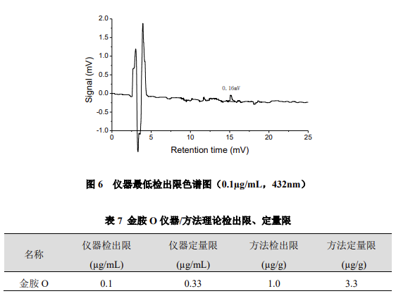 以峰高約為 3 倍信噪比對(duì)應(yīng)濃度為儀器檢出限,以 10 倍信噪比計(jì)算儀器定量限,噪聲按 0.05mV 計(jì)算,金胺 O 儀器 / 方法理論檢出限、定量限結(jié)果如下。