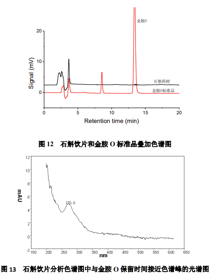 峰,說(shuō)明該 5 種藥材中不含有金胺 O。石斛分析譜圖與金胺 O 標(biāo)準(zhǔn)品保留時(shí)間一致處,有一個(gè)色譜峰 (峰高 0.19mV),提取該色譜峰光譜圖 (圖 13),與金胺 O 光譜圖不一致,說(shuō)明該色譜峰不是金胺 O。
