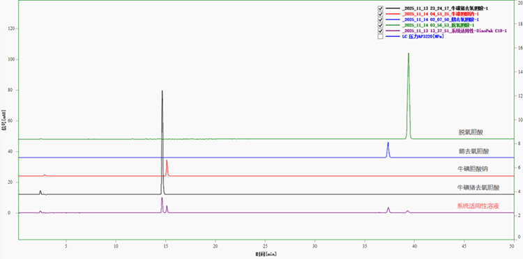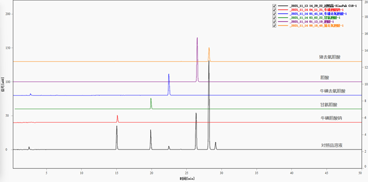 圖1顯示了人工牛黃膽酸類系統(tǒng)適用性溶液在SinoPak C18色譜柱上的分離色譜圖。圖中四個色譜峰(依次為?;秦i去氧膽酸、?;悄懰徕c、鵝去氧膽酸、脫氧膽酸)基線分離良好,峰形尖銳對稱,直觀表明該色譜系統(tǒng)對這幾類結(jié)構(gòu)相似的化合物具有優(yōu)異的分離能力。圖3為系統(tǒng)適用性溶液及對應(yīng)單標(biāo)在SinoPak C18色譜柱上分離的疊加色譜圖,進一步證實了系統(tǒng)適用性溶液與對照品溶液中對應(yīng)峰的一致性。