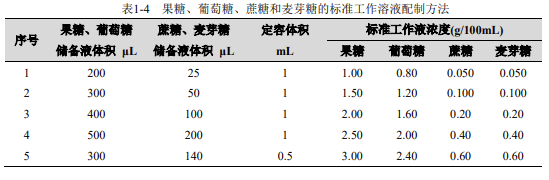 按照表 1-4 分別將四種單糖的儲(chǔ)備液配成所需混標(biāo)濃度(標(biāo)準(zhǔn)曲線濃度):