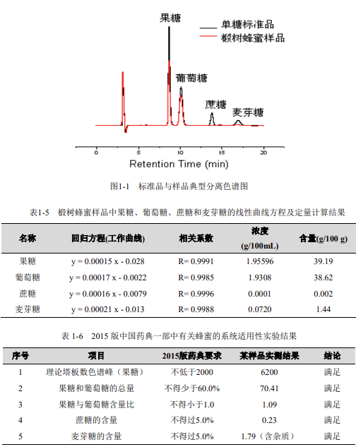 (譜圖含果糖、葡萄糖、蔗糖、麥芽糖特征峰,標(biāo)注 “單糖標(biāo)準(zhǔn)品”“椴樹蜂蜜樣品”,橫坐標(biāo)為保留時(shí)間 min)