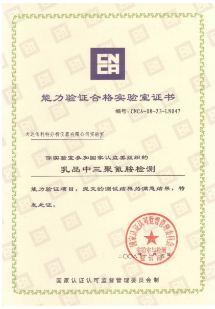 大連依利特分析儀器有限公司作為國(guó)內(nèi)知名廠家,秉承著 “質(zhì)量更佳、服務(wù)更優(yōu)、創(chuàng)新更快” 的理念,二十年來(lái)為食品安全、藥品檢測(cè)及高校應(yīng)用等眾多行業(yè)提供著完善的分析方法及先進(jìn)的儀器配置。從蘇丹紅、孔雀石綠到 “三鹿奶粉三聚氰胺” 事件,關(guān)系著國(guó)計(jì)民生的 “食品安全” 問題一次次為我們敲響警鐘,并引起社會(huì)廣泛關(guān)注。針對(duì) “三聚氰胺” 事件,依利特人在第一時(shí)間做出反應(yīng),榮獲由國(guó)家認(rèn)證認(rèn)可監(jiān)督管理委員會(huì)頒發(fā)的 “能力驗(yàn)證合格實(shí)驗(yàn)室證書”,并且按照 GB/T 22388-2008《原料乳與乳制品中三聚氰胺檢測(cè)方法》、GB/T 22400-2008《原料乳中三聚氰胺快速檢測(cè) 液相色譜法》的國(guó)家標(biāo)準(zhǔn),在經(jīng)過大量實(shí)驗(yàn)驗(yàn)證后,提供出符合國(guó)標(biāo)的三聚氰胺檢測(cè)解決方案,包括分析方法驗(yàn)證及推薦儀器配置在內(nèi)的全套解決方案。