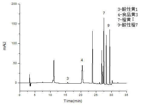 食品黃3、酸性黃1、橙黃Ⅰ、酸性橙7為480nm。