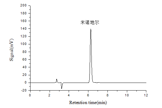 進(jìn)樣分析濃度為20.0mg/L米諾地爾標(biāo)準(zhǔn)工作液,使用1.3.3中的色譜條件,結(jié)果如下圖所示。
