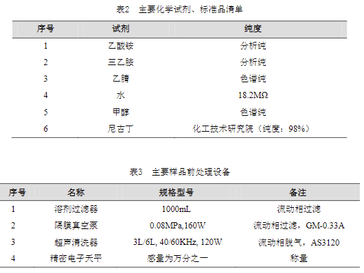 實(shí)驗(yàn)過程中其它玻璃器皿還包括容量瓶 (100mL、50mL、25mL、10mL)、移液槍 (0~1000μL,0~5000μL)、移液槍槍頭 (1mL,5mL)、一次性 PVC 手套、一次性口罩、進(jìn)樣針、樣品瓶、濾膜等若干。