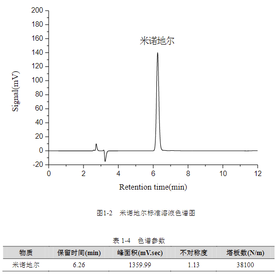 進樣分析濃度為 20.0mg/L 米諾地爾標準工作液,使用 1.3.3 中的色譜條件,結(jié)果如下圖所示: