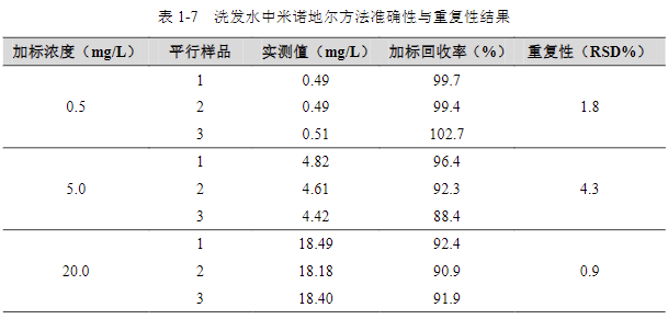 在添加濃度 0.5mg/L、5.0mg/L、20.0mg/L 濃度范圍內(nèi),測得回收率 88.4%~102.7%,相對標準偏差為 0.9%~4.3%。