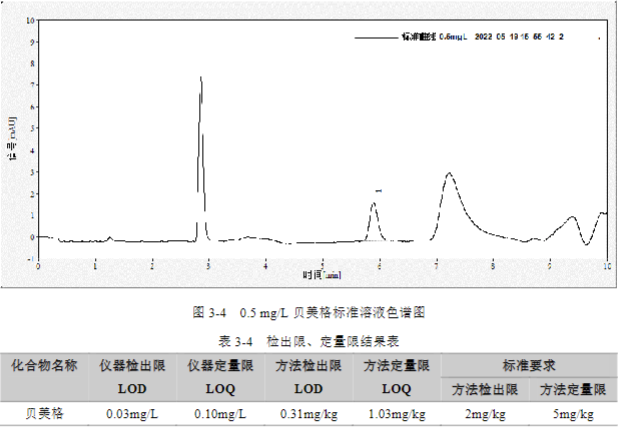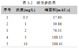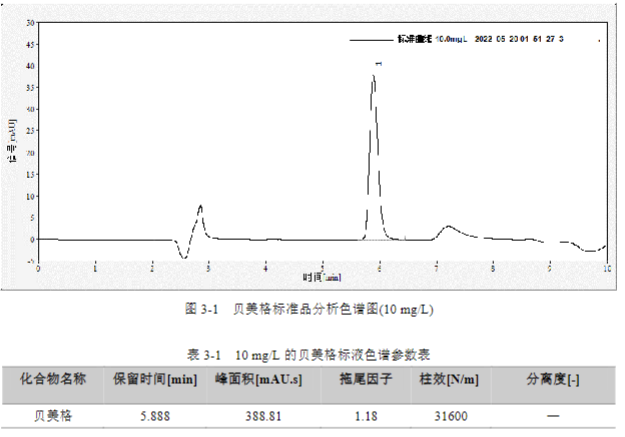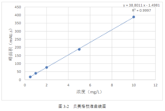 按 GB/T 40898-2021 標準中方法,配制貝美格的標準溶液,質量濃度為 0.5 mg/L、1 mg/L、2 mg/L、5 mg/L 和 10 mg/L 的五個標點,計算相關線性系數(shù)。