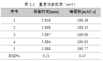 用濃度為 5 mg/L 甲巰咪唑標準溶液,連續(xù)進樣 7 針,峰面積和保留時間 RSD 結果如下: