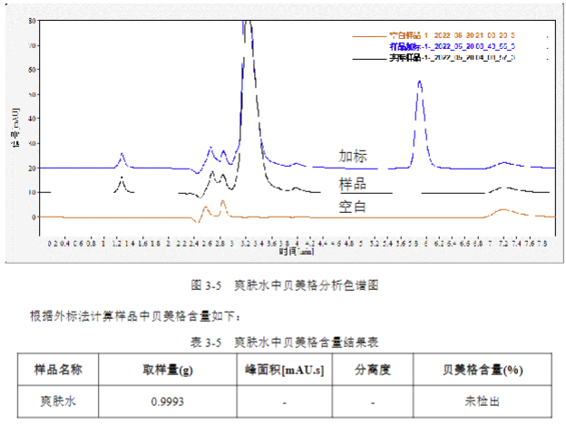 高清資料:圖 3-1 至圖 3-5 高清色譜圖(含基線噪聲放大細節(jié))、不同基質(乳液 / 爽膚水)樣品檢測譜圖;