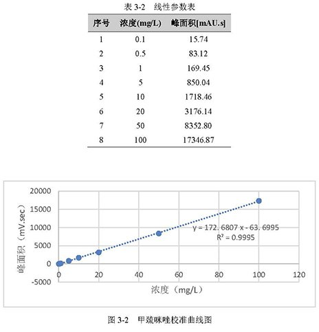 參照 GB/T 40894-2021 標準中方法,配制甲巰咪唑的標準溶液,質(zhì)量濃度為 0.1 mg/L、0.5 mg/L、1 mg/L、5 mg/L、10 mg/L、20 mg/L、50 mg/L 和 100 mg/L 的八個標點,計算相關(guān)線性系數(shù)。