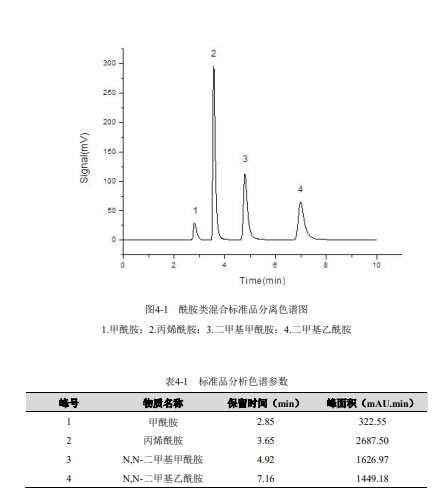 準(zhǔn)確稱(chēng)取 0.100g (精確至 ±0.0001g) 甲酰胺、0.100g (精確至 ±0.0001g) N,N - 二甲基甲酰胺、0.100g (精確至 ±0.0001g) N,N - 二甲基乙酰胺和 0.100g (精確至 ±0.0001g) 丙烯酰胺,用水溶解后全量轉(zhuǎn)入 100mL 容量瓶中,用水稀釋定容至標(biāo)線(xiàn),搖勻。配制成甲酰胺、N,N - 二甲基甲酰胺、N,N - 二甲基乙酰胺和丙烯酰胺濃度分別為 1000mg/L、500mg/L、1000mg/L 和 500mg/L 的酰胺類(lèi)化合物混合標(biāo)準(zhǔn)貯備液,于 4℃以下冷藏、避光和密封可保存三個(gè)月,使用時(shí)應(yīng)恢復(fù)至室溫并搖勻。
