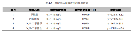 分別移取 0.10mL、2.50mL、5.00mL、8.00mL、10.00mL 酰胺類(lèi)化合物標(biāo)準(zhǔn)使用液置于一組 50mL 容量瓶中,用水定容至標(biāo)線(xiàn),搖勻。由低濃度到高濃度依次移取 5.0μL 注入液相色譜儀,按照液相色譜參考條件進(jìn)行分析測(cè)定。以標(biāo)準(zhǔn)系列溶液中目標(biāo)化合物的濃度 (mg/L) 為橫坐標(biāo),以峰高或峰面積為縱坐標(biāo),建立酰胺類(lèi)化合物標(biāo)準(zhǔn)曲線(xiàn)。