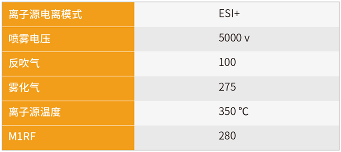 以下參數(shù)以依利特科技 EClassical 3200L-MS2 Vertical 9100 三重四極桿質(zhì)譜儀為例,離子源參數(shù)及目標(biāo)化合物質(zhì)譜參數(shù)見表 2 和表 3。