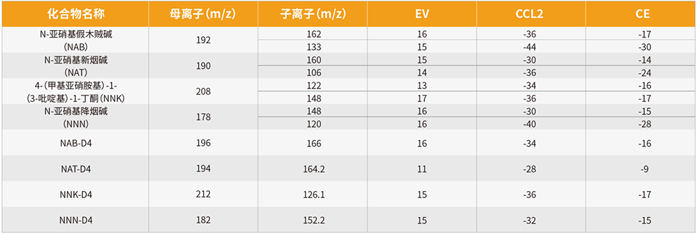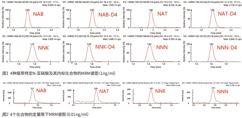 液質(zhì)聯(lián)用技術(shù)結(jié)合了色譜強(qiáng)大的分離功能和質(zhì)譜準(zhǔn)確的定性功能,能很好的分析痕量水平的 TSNAS,并且前處理方法簡單快速,與傳統(tǒng)的 GC-TEA 方法相比,靈敏度更高、選擇性更強(qiáng)。故本文參考中國煙草總公司企業(yè)標(biāo)準(zhǔn) YO/T 17-2012《卷煙主流煙氣總粒相物中煙草特有 N - 亞硝胺的測定 高效液相色譜 - 串聯(lián)質(zhì)譜聯(lián)用法》,采用 EClassical 3200L-MS2 Vertical 9100 液相質(zhì)譜聯(lián)用系統(tǒng)對卷煙主流煙氣中的特有 N - 亞硝胺進(jìn)行測定,其四種物質(zhì)的定量限完全滿足并在靈敏度和檢測速度優(yōu)于標(biāo)準(zhǔn)的檢測需求。