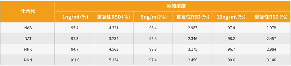 同時(shí)考察了 1ng/ml、5ng/ml、10ng/ml 添加濃度下的加標(biāo)回收率和每個(gè)加標(biāo)濃度下 6 針的重現(xiàn)性測試 (見表 4),實(shí)驗(yàn)結(jié)果表明,該方法具有良好的回收率和重現(xiàn)性,完全滿足卷煙主流煙氣中特定 N - 亞硝胺含量的測定。
