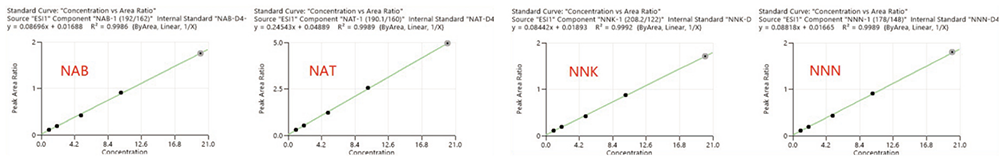 本文采用 EClassical 3200L-MS2 Vertical 9100 三重四極桿液質(zhì)聯(lián)用系統(tǒng)建立了快速、高效可靠的 LC-MS/MS 實(shí)驗(yàn)方法測定卷煙主流煙氣中 4 種特定 N - 亞硝胺,為其測定提供了可靠的高通量檢測手段,同時(shí)數(shù)據(jù)顯示,其重復(fù)性和線性均較好,遠(yuǎn)遠(yuǎn)滿足其標(biāo)準(zhǔn)需求,為用戶的高通量樣品的測定提供可靠的保障。