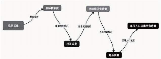 基于污水流行病學(xué)的現(xiàn)代禁毒情報(bào)工作,其實(shí)質(zhì)就是通過標(biāo)準(zhǔn)化的樣品采集與樣品分析方法,對(duì)特定區(qū)域內(nèi)污水中的毒品及其代謝物的濃度進(jìn)行檢測(cè),通過引入降解損失校正、污水流速校正、人體代謝校正以及人口數(shù)量校正等方法,反算該地區(qū)某種(類)毒品的量,分析流程下圖所示。