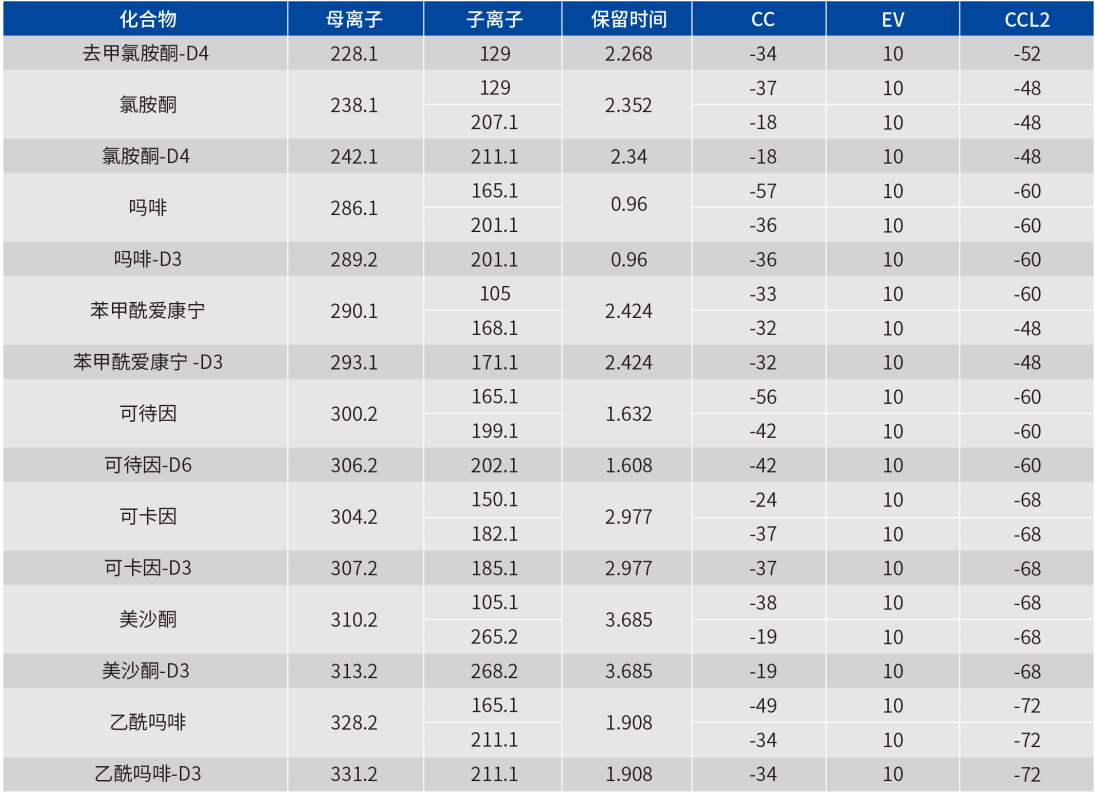 以下參數(shù)以 EClassical 3200L-MS2 Vertical 9100 三重四極桿液質(zhì)聯(lián)用儀為例,目標(biāo)化合物質(zhì)譜參數(shù)見表 2。