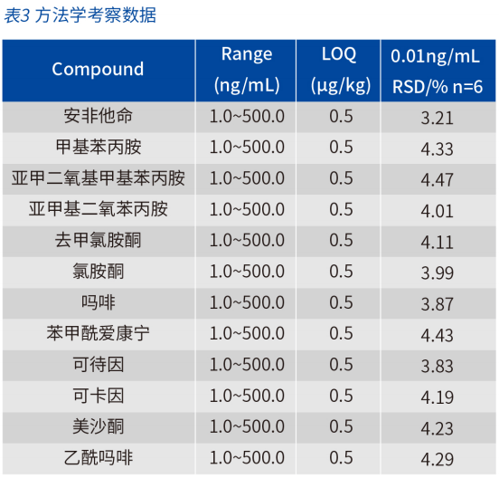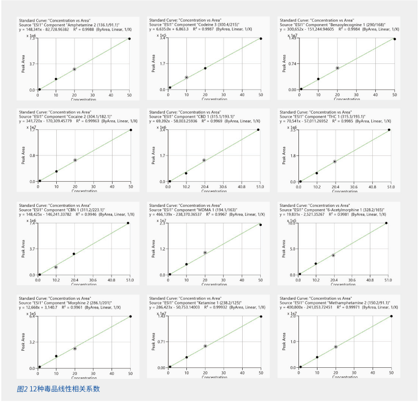 圖1中展示了采用12種毒品的提取離子流色譜圖,經(jīng)色譜條件優(yōu)化,各個(gè)化合物的峰形對(duì)稱,獲得優(yōu)異的色譜分離效果,圖2是12種毒品標(biāo)準(zhǔn)曲線,表3為相關(guān)系數(shù)和檢出下限及重復(fù)性。