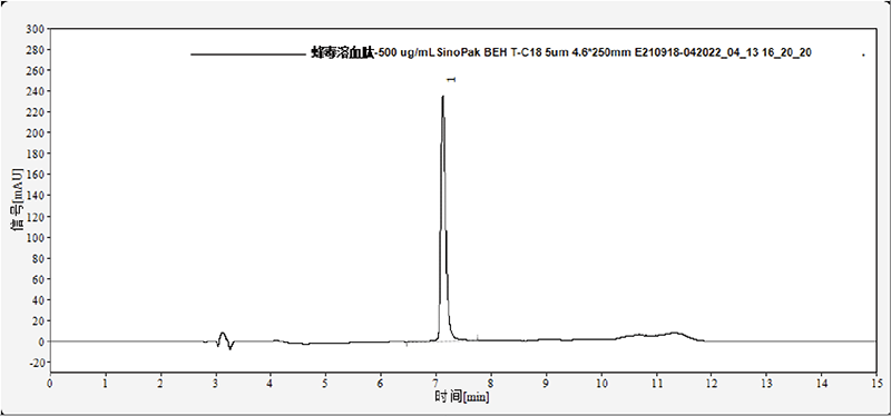 蜂毒溶血肽是一種由26個(gè)氨基酸組成的多肽,呈堿性,易溶于水,是一種人類所知的抗炎性強(qiáng)的物質(zhì)之一。依利特參考GB/T 40486-2021,采用新推出SinoPak BEH T-C18 5 μm色譜柱對(duì)蜂毒干粉中蜂毒溶血肽進(jìn)行分析檢測(cè),所得數(shù)據(jù)可供客戶參考使用。