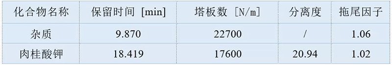 使用EClassical 3200液相色譜儀分析肉桂酸鉀粉末樣品,肉桂酸鉀目標(biāo)峰峰形良好,柱效高,且雜質(zhì)分離度非常好,滿足定性定量分析的需求。