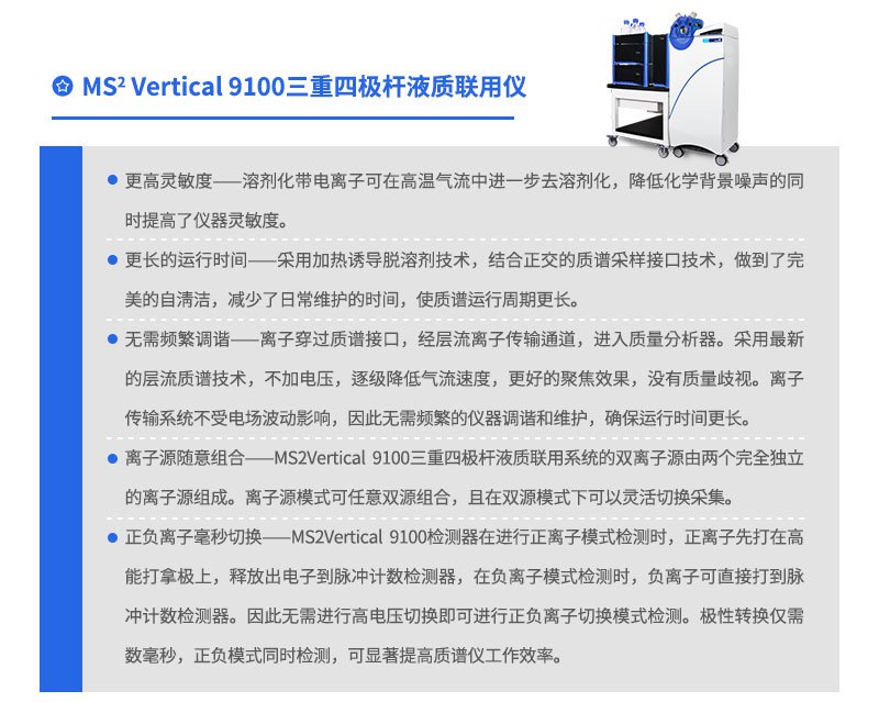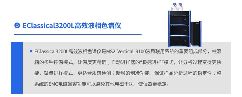 依利特MS2 Vertical 9100液質(zhì)聯(lián)用色譜系統(tǒng)用EClassical 3200L高效液相色譜儀與MS2 Vertical 9100三重四極桿質(zhì)譜儀聯(lián)用。充分發(fā)揮了EClassical 3200L耐高壓超高效液相色譜系統(tǒng)智能化、“極速進(jìn)樣”以及長期穩(wěn)定和精準(zhǔn)運(yùn)行的優(yōu)勢(shì),同時(shí)結(jié)合MS2 Vertical 9100三重四極桿質(zhì)譜儀的高靈敏度、耐污染、雙離子源隨意組合、正負(fù)離子毫秒切換的特點(diǎn),真正實(shí)現(xiàn)了快速、靈敏、便捷、穩(wěn)定的長期 LC-MS/MS測(cè)試運(yùn)行。